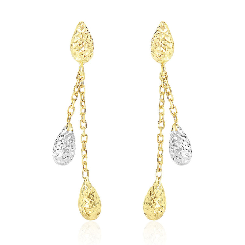 14k Two-Tone Gold Double Row Chain Earrings with Diamond Cut Teardrops