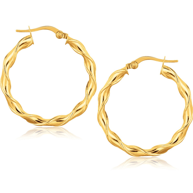 These twist hoop earrings are crafted in 14k yellow gold and measure 1 1/8 inch length and width, featuring a snap lock backing.