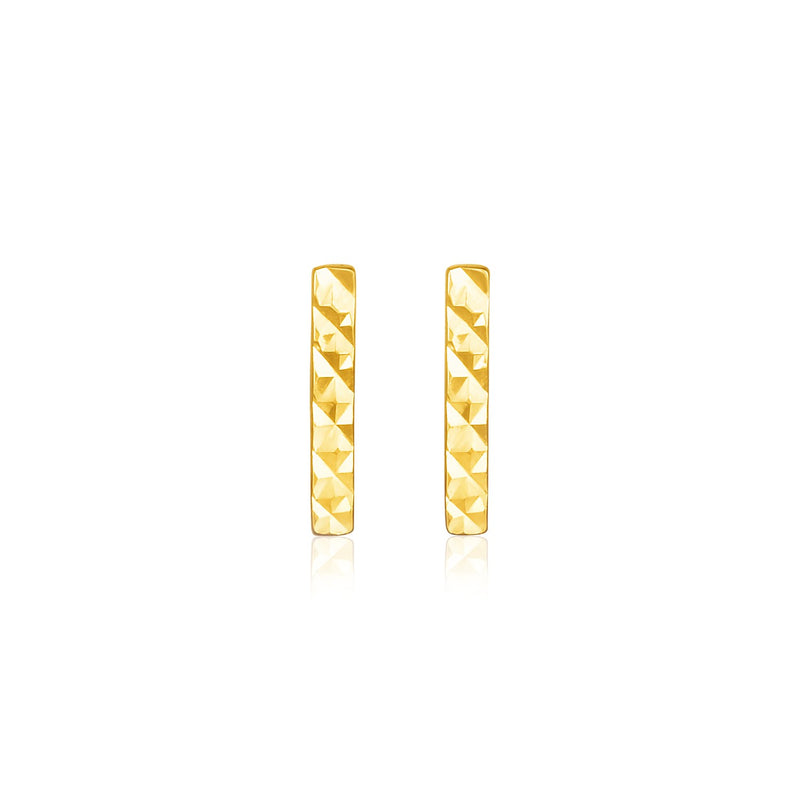 Hermosas y sencillas barras de oro amarillo de 14k están decoradas con una hermosa textura en estos aretes únicos. Los pendientes de poste se mantienen en su lugar mediante cierres a presión.