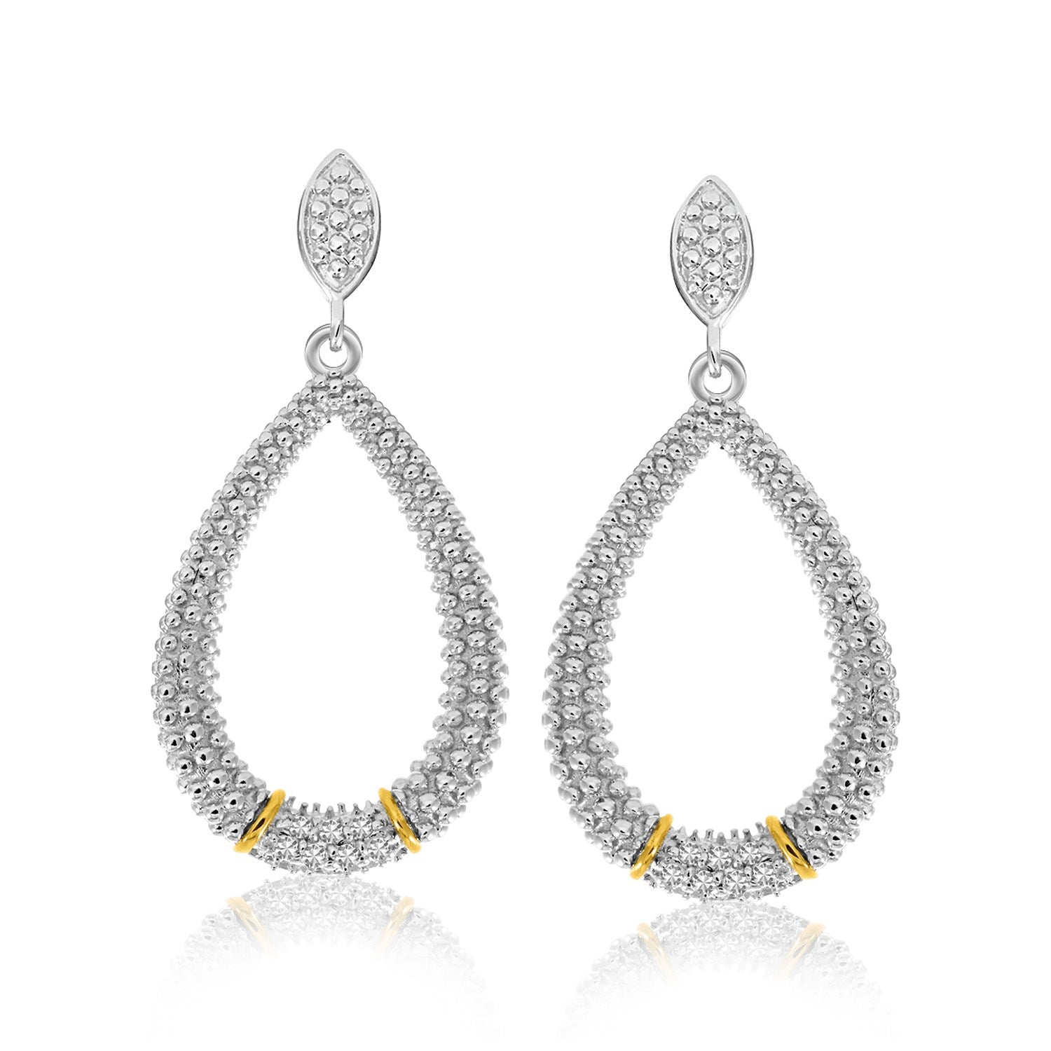 Polished 18k yellow gold border detailing provides contrast to the .13ct diamonds accenting these popcorn graduated teardrop earrings. Designed in rhodium finished sterling silver.
