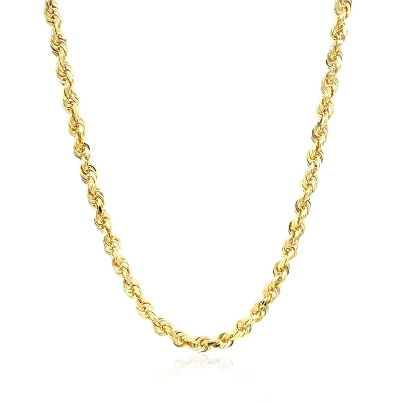 This solid diamond cut rope chain comes in 10k yellow gold and has a width of 3.5 millimeters.