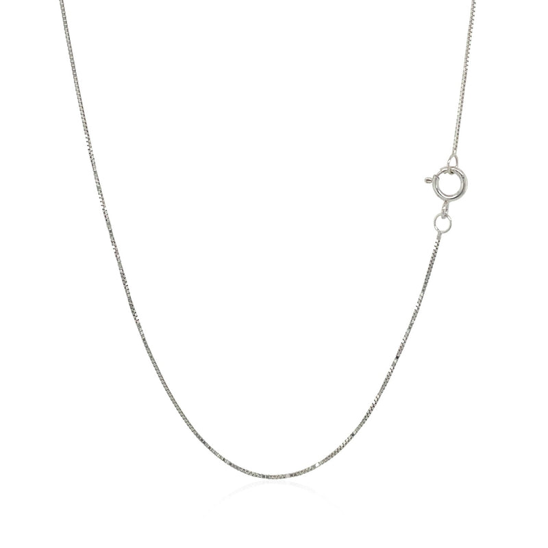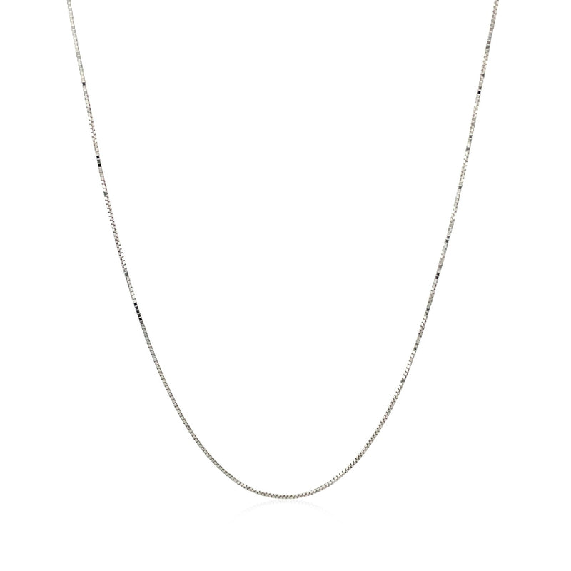 This classic box chain comes in 14k white gold and has a width of 0.45 millimeters.