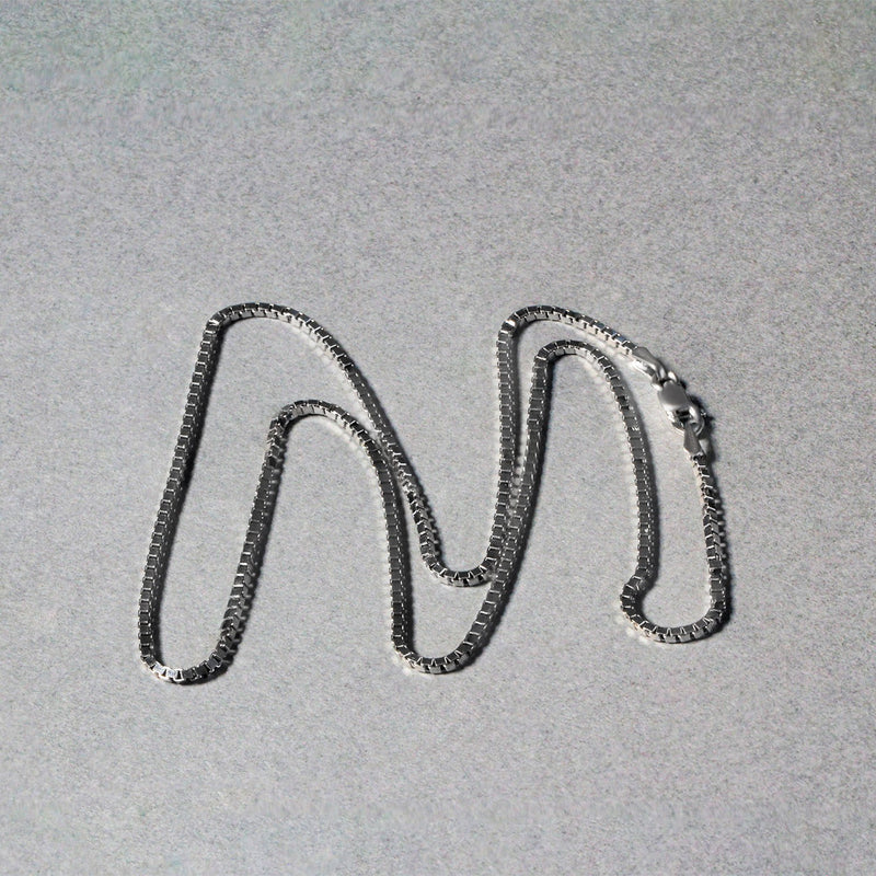 This classic box chain comes in 14k white gold and has a width of 1.4 millimeters.