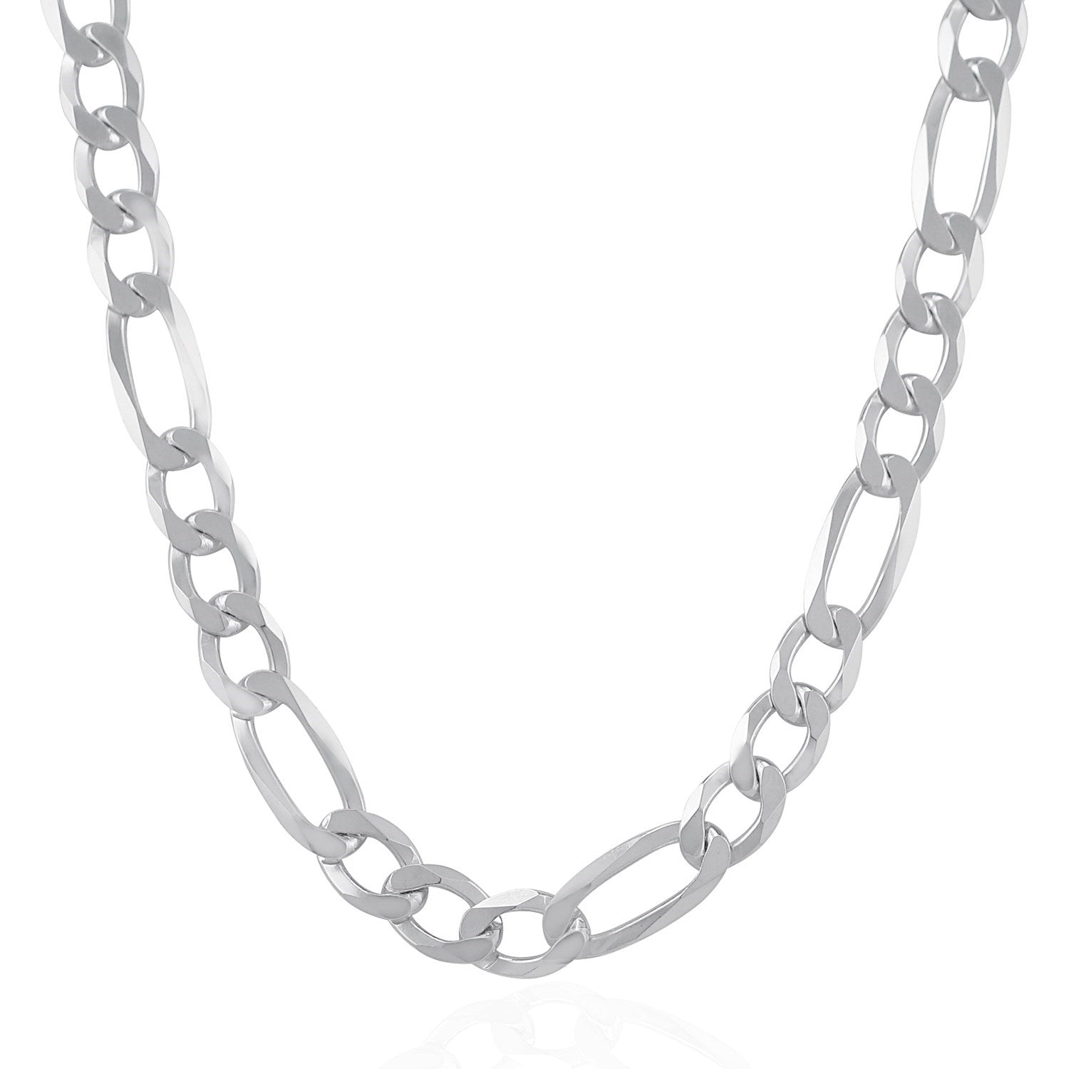 This classic rhodium plated chain is crafted in gleaming sterling silver and has a width of 11.6 millimeters. Featuring a Figaro chain design, it is secured with a lobster clasp.