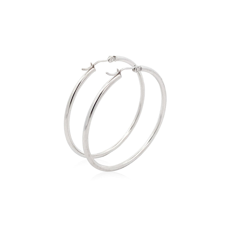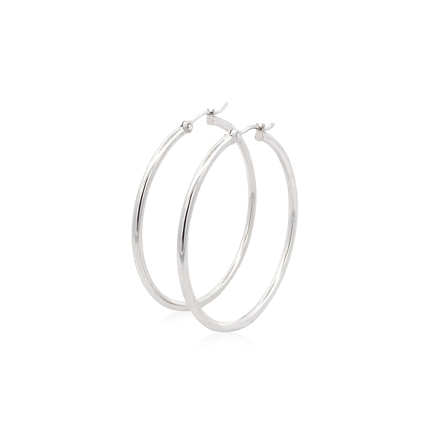 These timeless hoop earrings crafted in 14k white gold and measure 40 millimeters in diameter, featuring a snap lock backing.