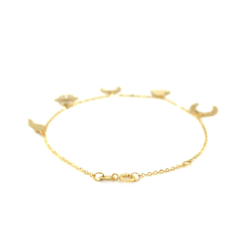 The lovely charms of this eye-catching 14k yellow gold bracelet capture celestial themes and hopes of luck and prosperity. Bracelet is 7 inches long and closes with a spring ring clasp.