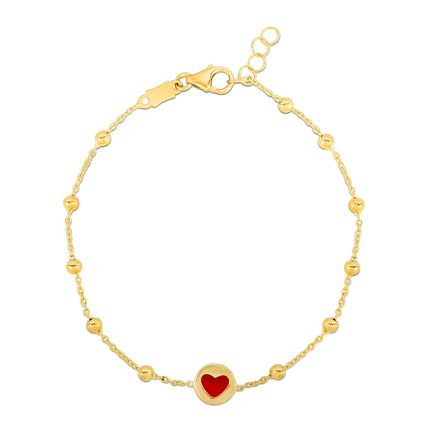 A single red enameled heart and lovely polished beads decorate this beautiful 14k yellow gold children's bracelet. Bracelet is 6 inches and closes with a lobster clasp.