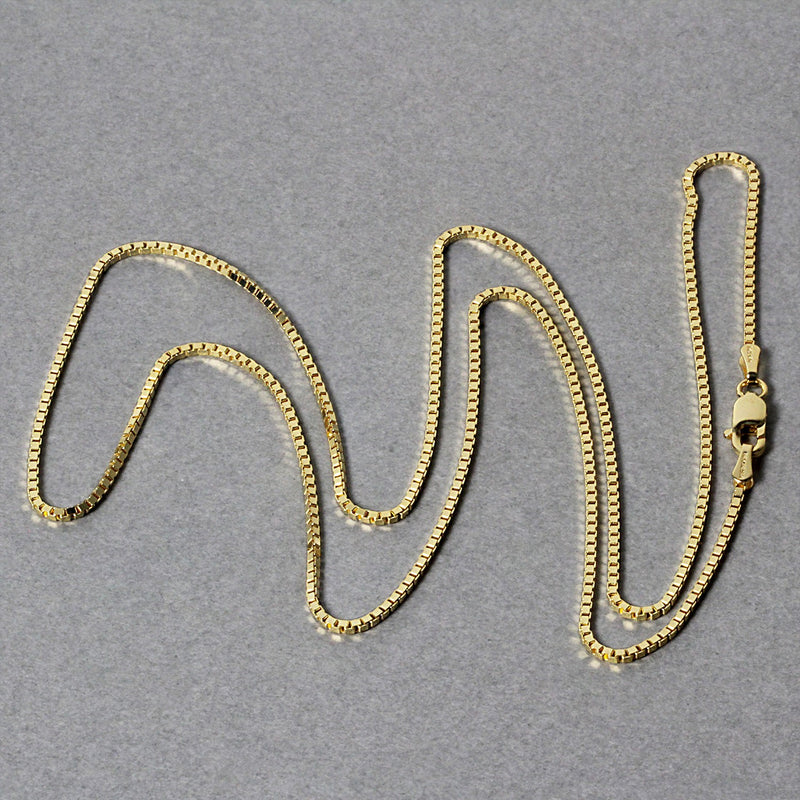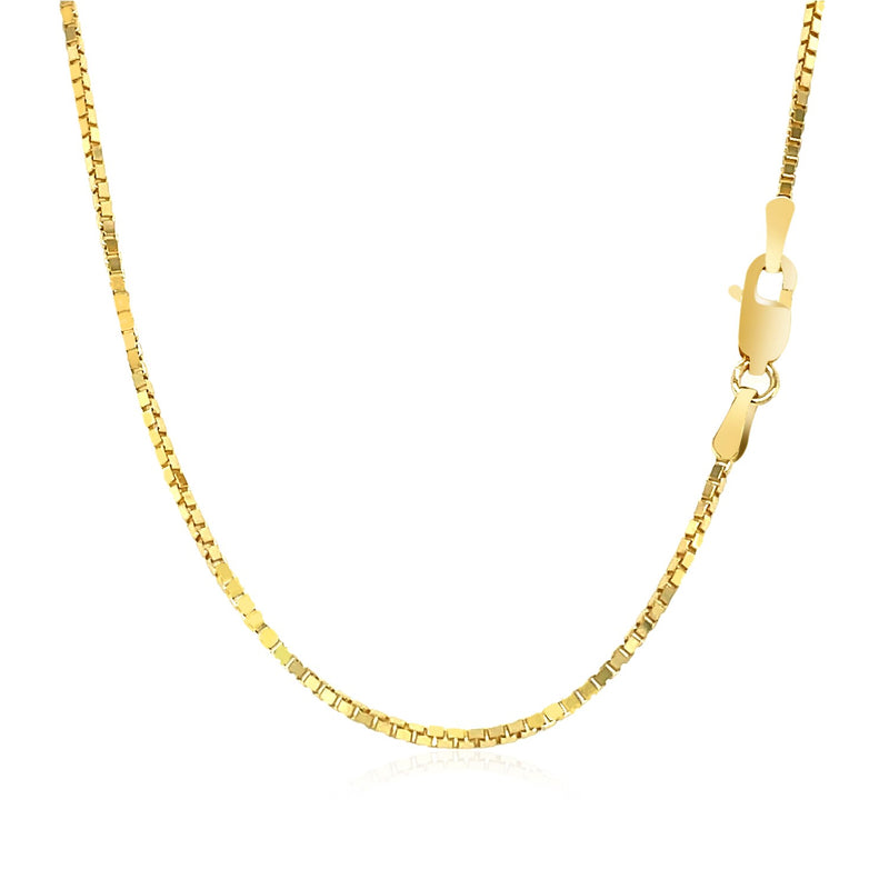 This classic box chain comes in 14k yellow gold and has a width of 1.1 millimeters.
