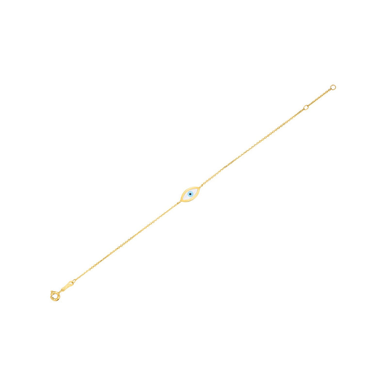 This beautiful 14k yellow gold Mother Of Pearl Evil Eye bracelet comes in a high polish finish & closes with a spring clasp. This stunning piece is hand crafted & sits effortlessly between a glimmering rolo chain. Uniquely balanced in the center is a beautiful piece of Mother Of Pearl that creates a unique look. Measuring 7 inches in length.