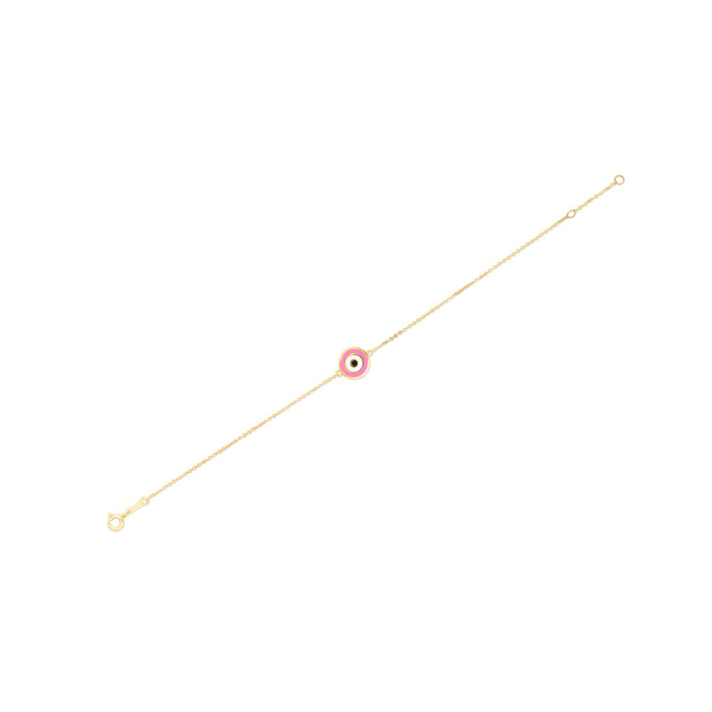 This beautiful 14k yellow gold Pink Evil Eye bracelet comes in a high polish finish & closes with a spring clasp. This piece is hand crafted & sits effortlessly between a glimmering rolo chain. With a touch of protection & a touch of style this piece is sure to stand out. Measuring 7 inches in length.