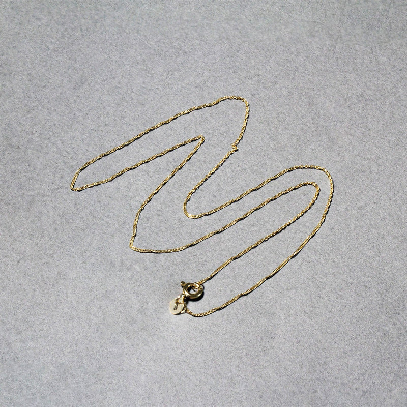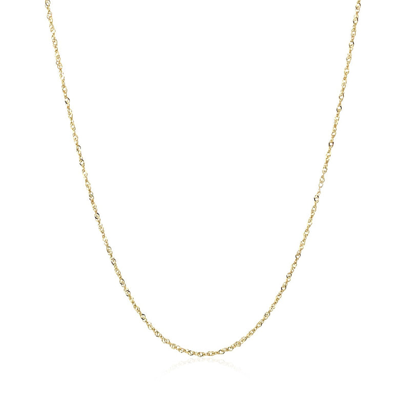 This Singapore chain comes in 14k yellow gold and has a width of 0.8 millimeters.