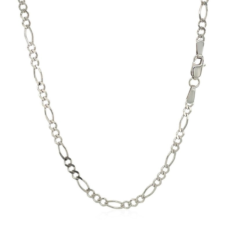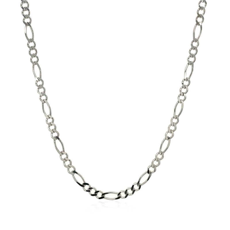 This solid Figaro chain comes in 14k white gold and has a width of 2.6 millimeters.
