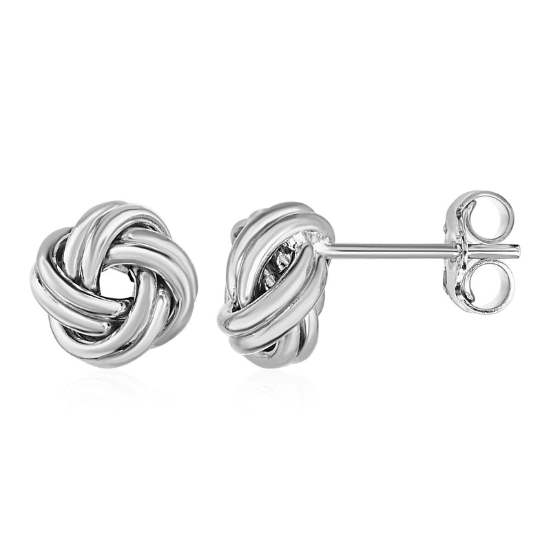Shiny, classic love knots adorn these elegant white gold post earrings. Earrings held in place with pushback clasps.