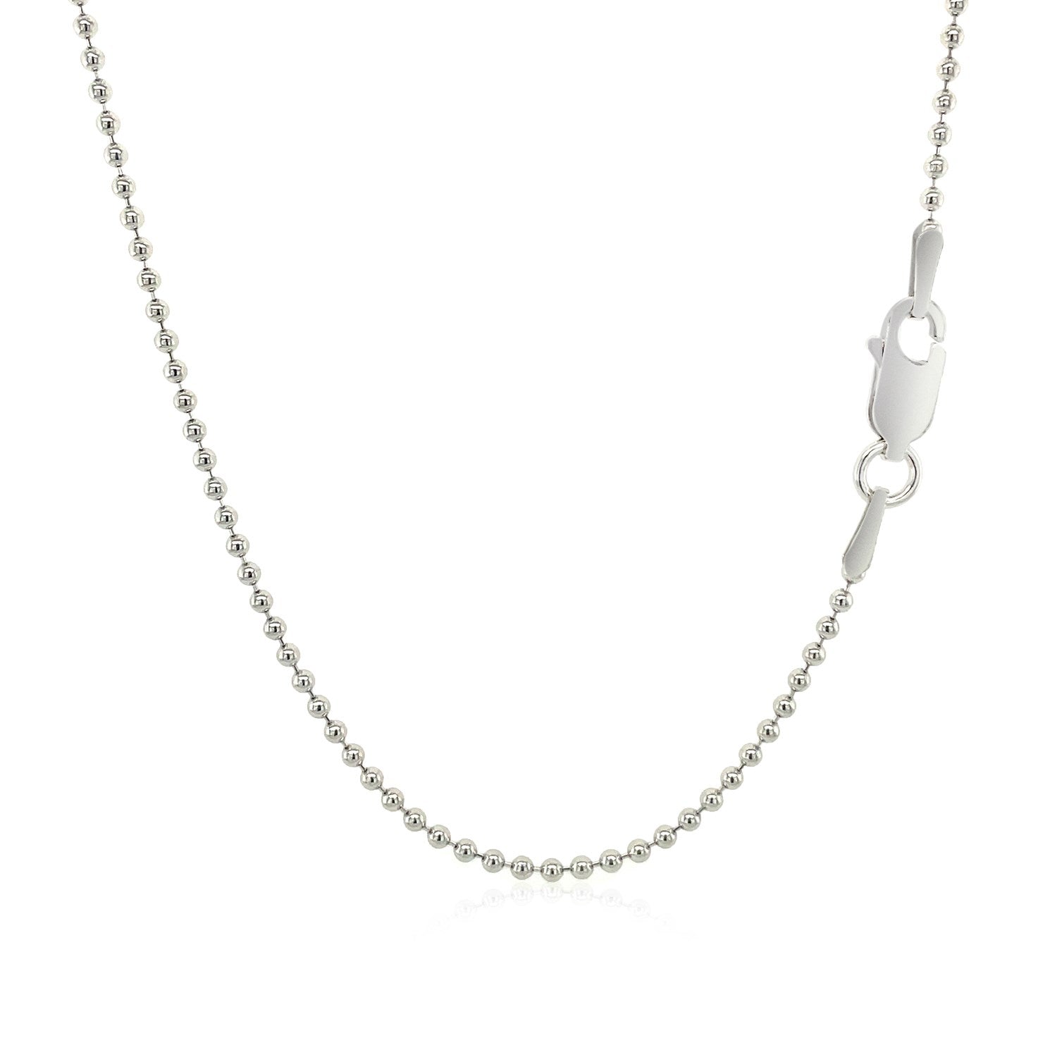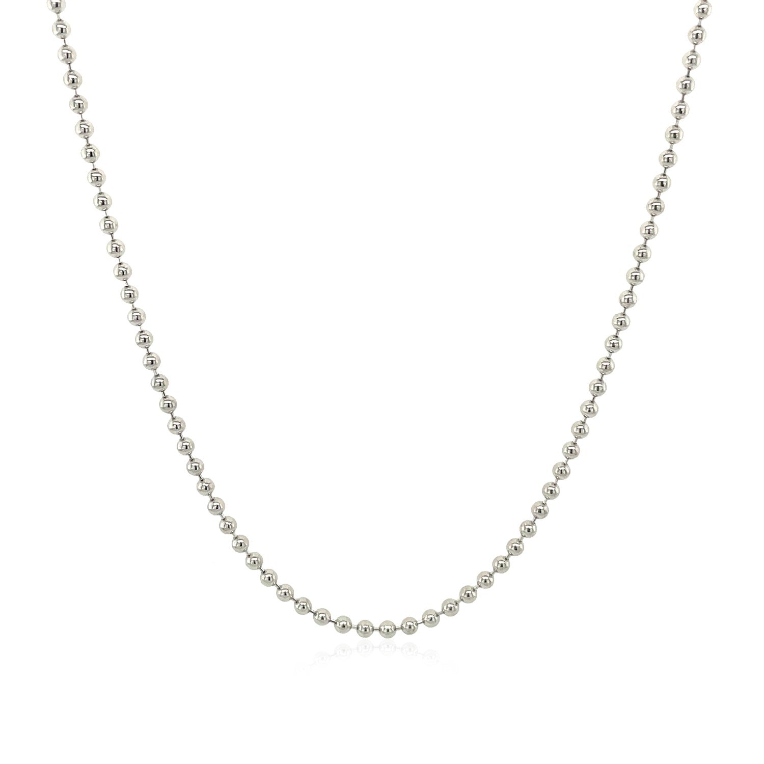 This classic rhodium plated chain is crafted in gleaming sterling silver and has a width of 1.5 millimeters. Featuring a bead chain design, it is secured with a lobster clasp.