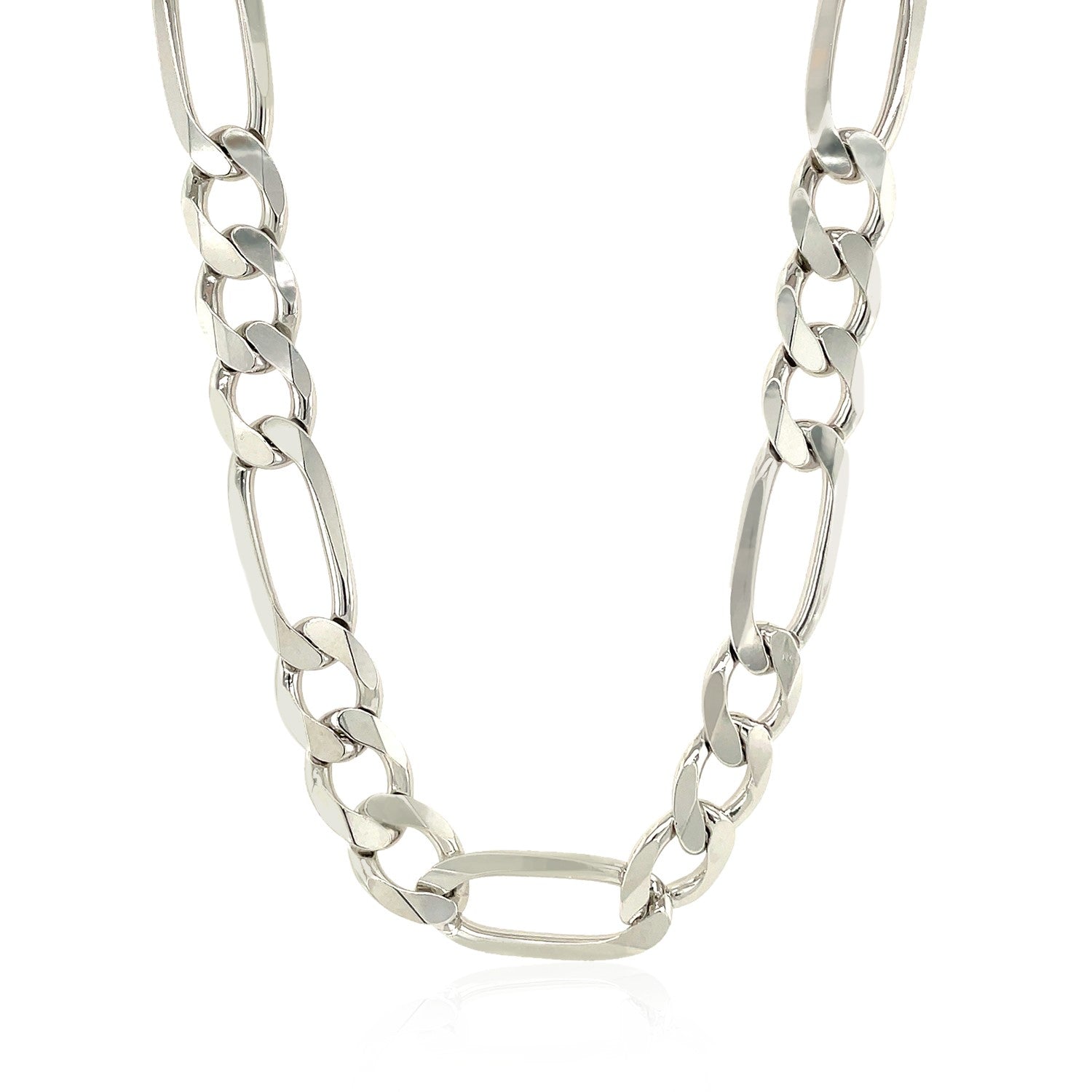 This classic rhodium plated chain is crafted in gleaming sterling silver and has a width of 9.0 millimeters. Featuring a Figaro chain design, it is secured with a lobster clasp.
