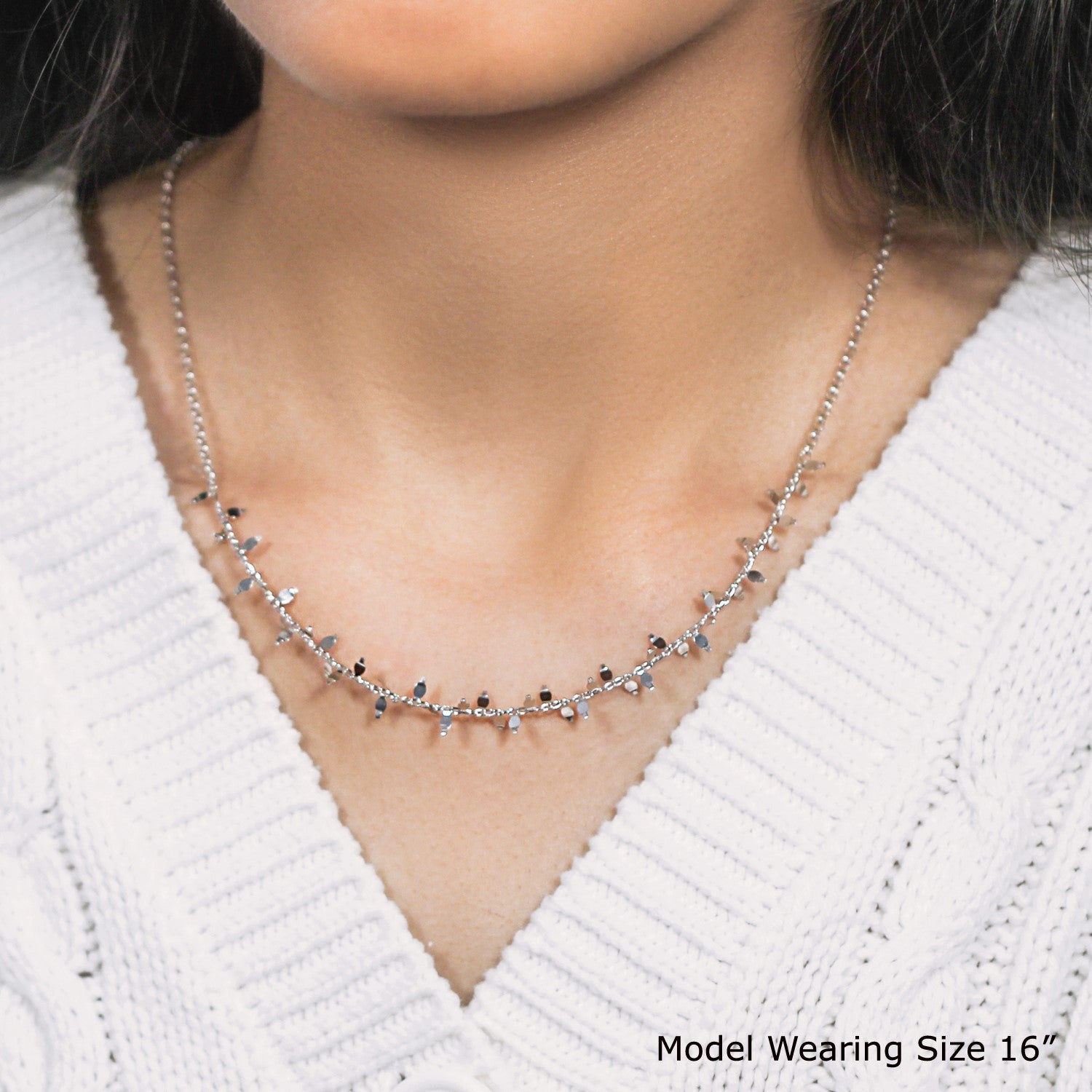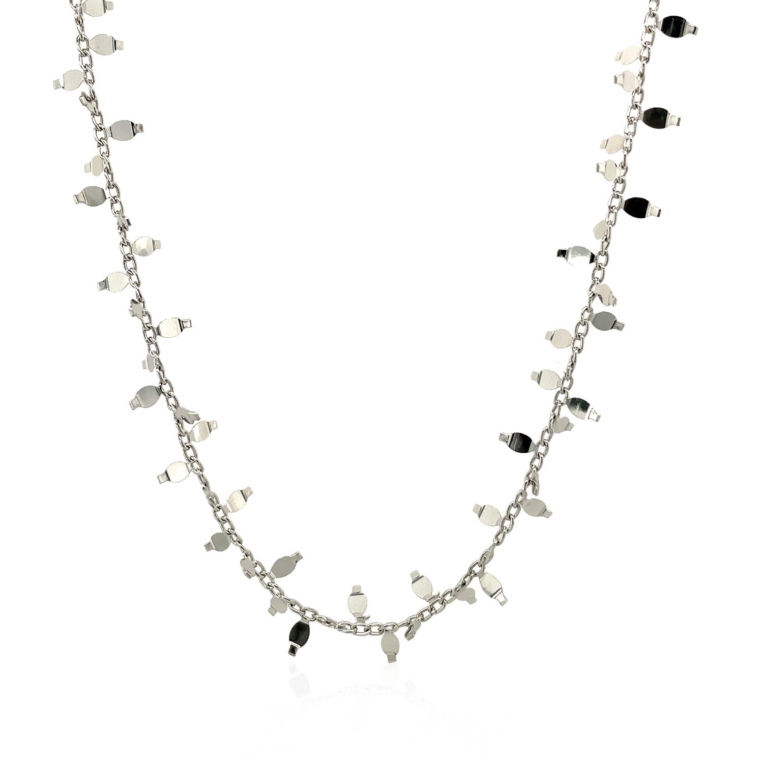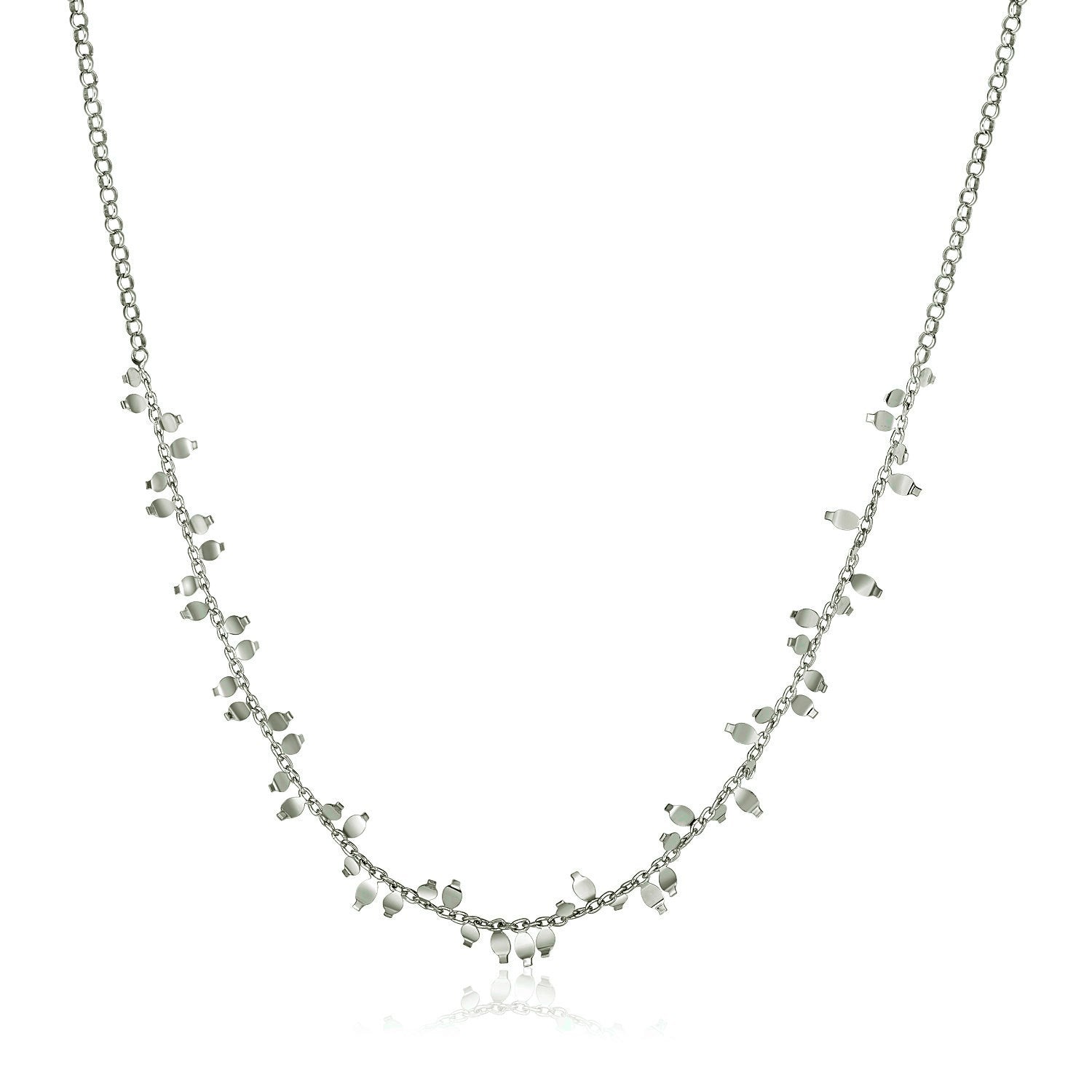 Like a glistening vine, beautiful polished leaf-like shapes decorate a simple sterling silver chain to form this exquisite necklace. Necklace is 18 inches long and closes with a lobster clasp.
