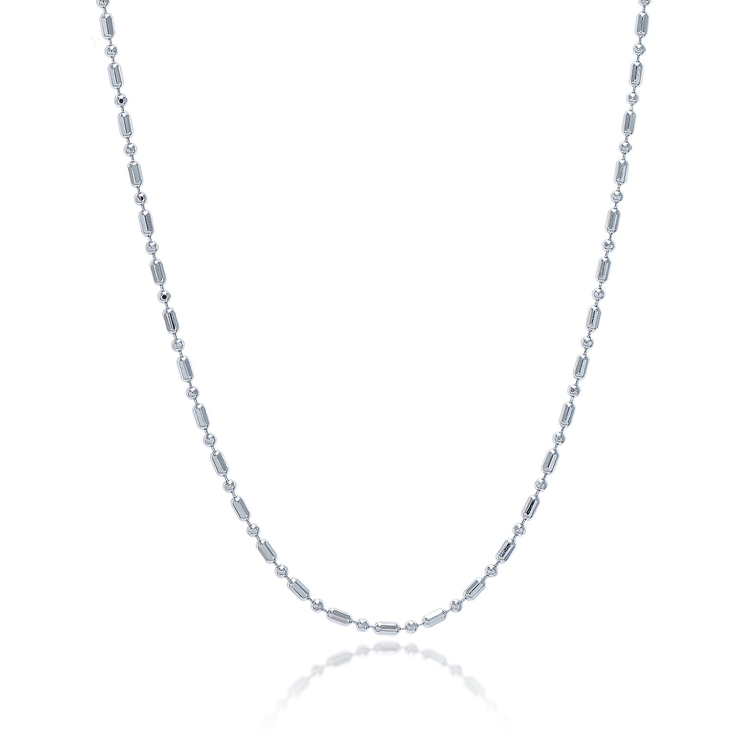 This rhodium-plated bead chain comes in sterling silver and has a width of 1.5 millimeters.