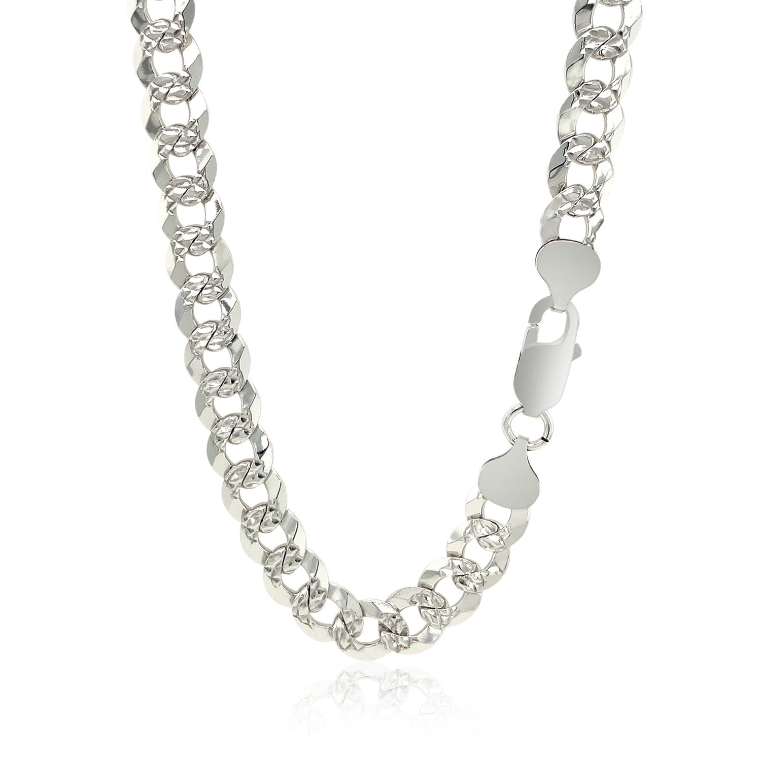 This rhodium-plated curb chain comes in sterling silver and has a width of 8.4 millimeters.