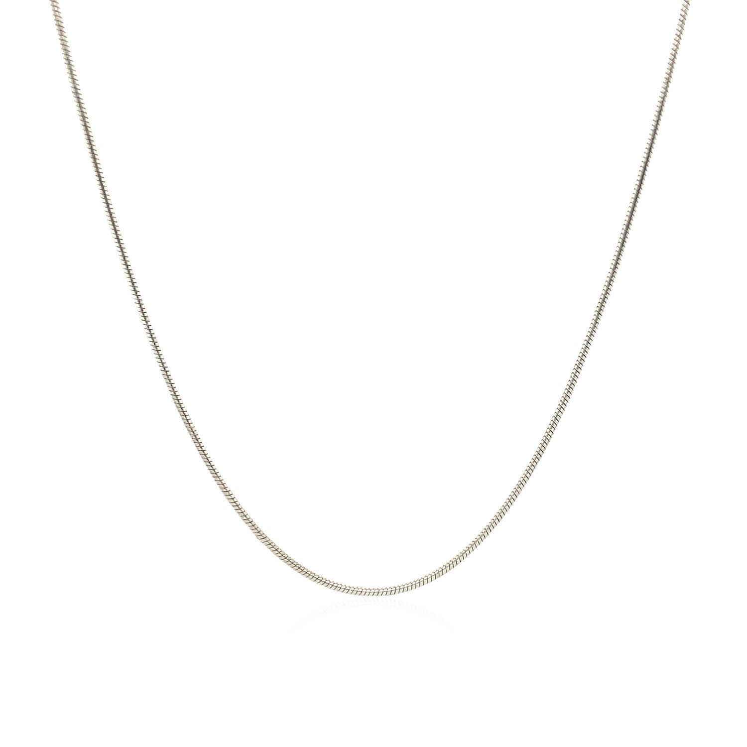 This rhodium-plated snake chain comes in sterling silver and has a width of 0.9 millimeters.